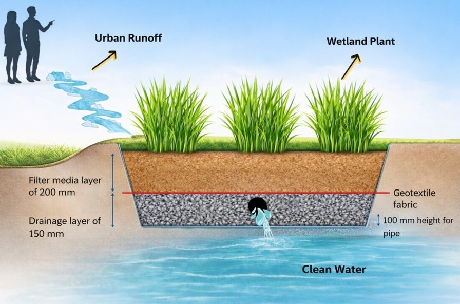 This biofilter is made up of three main layers: a filter media layer, a drainage and geotextile layer, and a submerged zone created by a raised outlet pipe. Native wetland plants play an important role by absorbing excess nutrients, trapping sediments and pollutants, and helping the soil retain moisture.