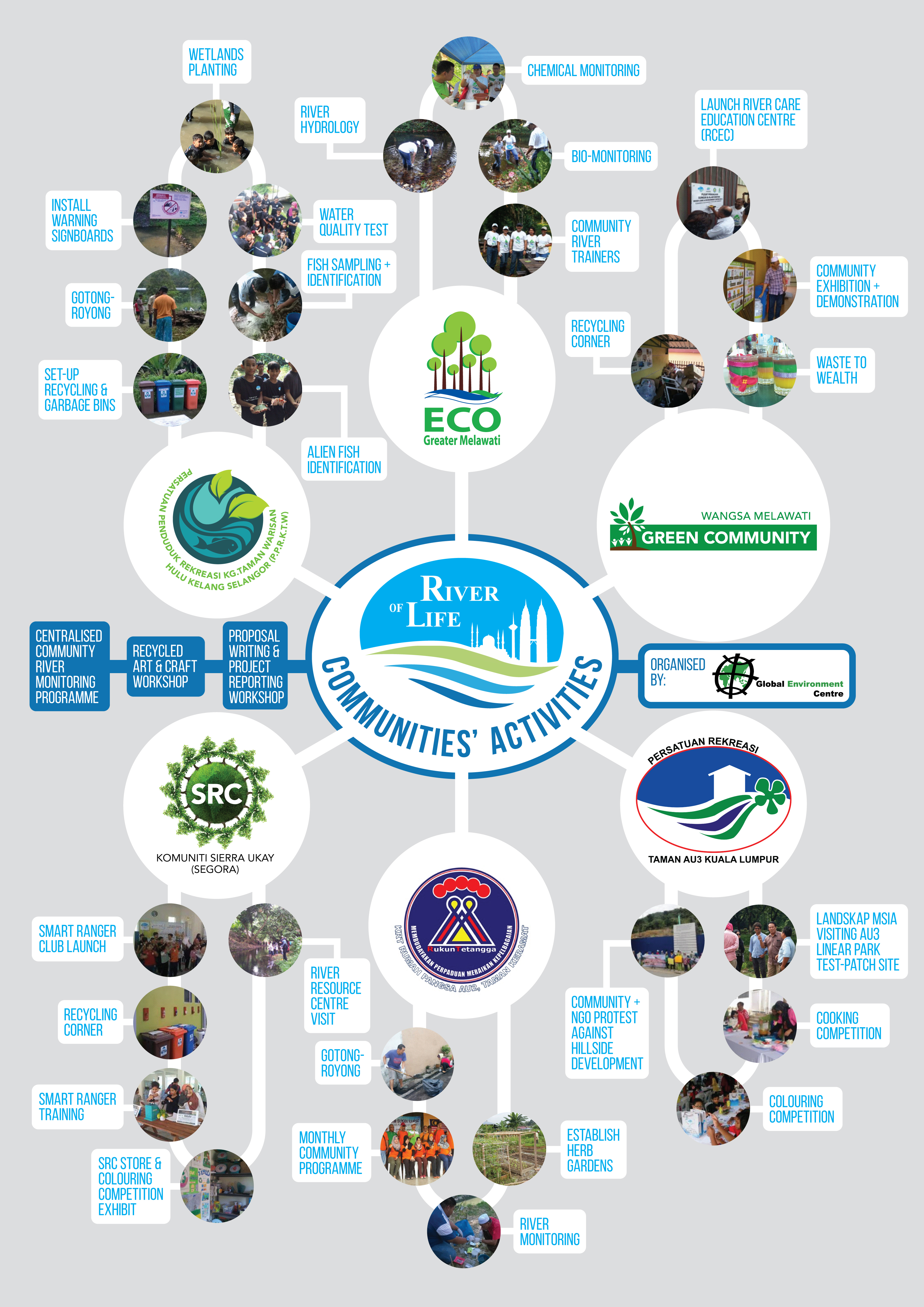 - total of 5 training and education activities have been organized with and by the local communities of Persatuan Penduduk Rekreasi Kg. Taman Warisan Hulu Kelang Selangor (P.P.R.K.T.W) and Society of Eco-Greater Melawati (SEGM). The communities played proactive role as trainers and as well as the facilitators for the training in Taman Warisan’s River Resource Centre (RRC).